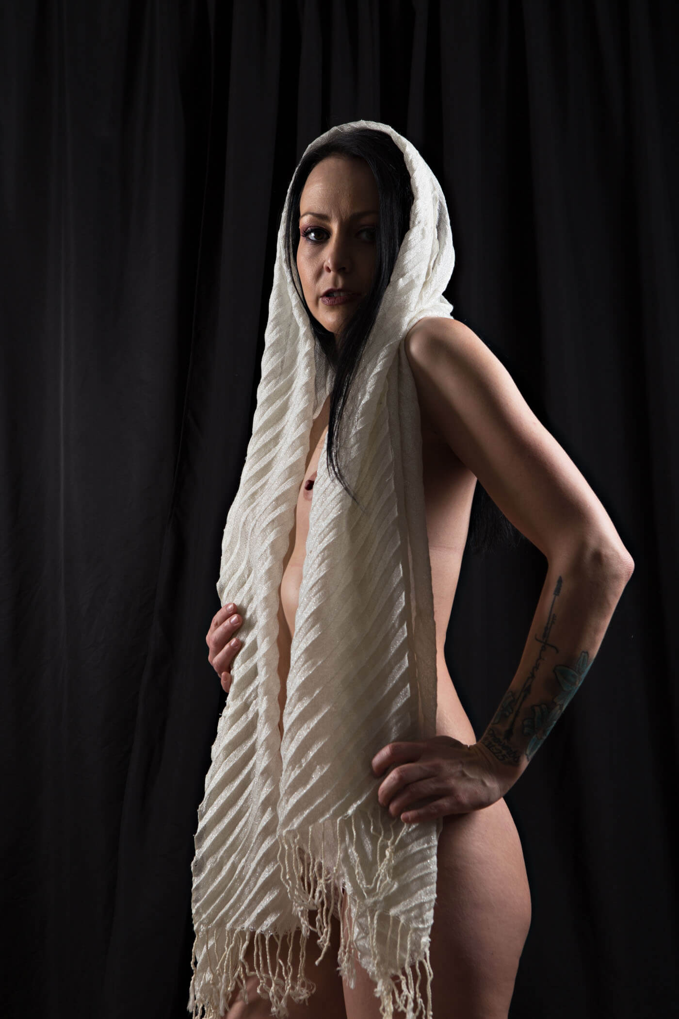 This is a set of images taken with Lucy Greene during one of our shoots together. She is posing against a black backdrop while wearing white panties and a white cloth. Photographed in studio on 12-06-2020.