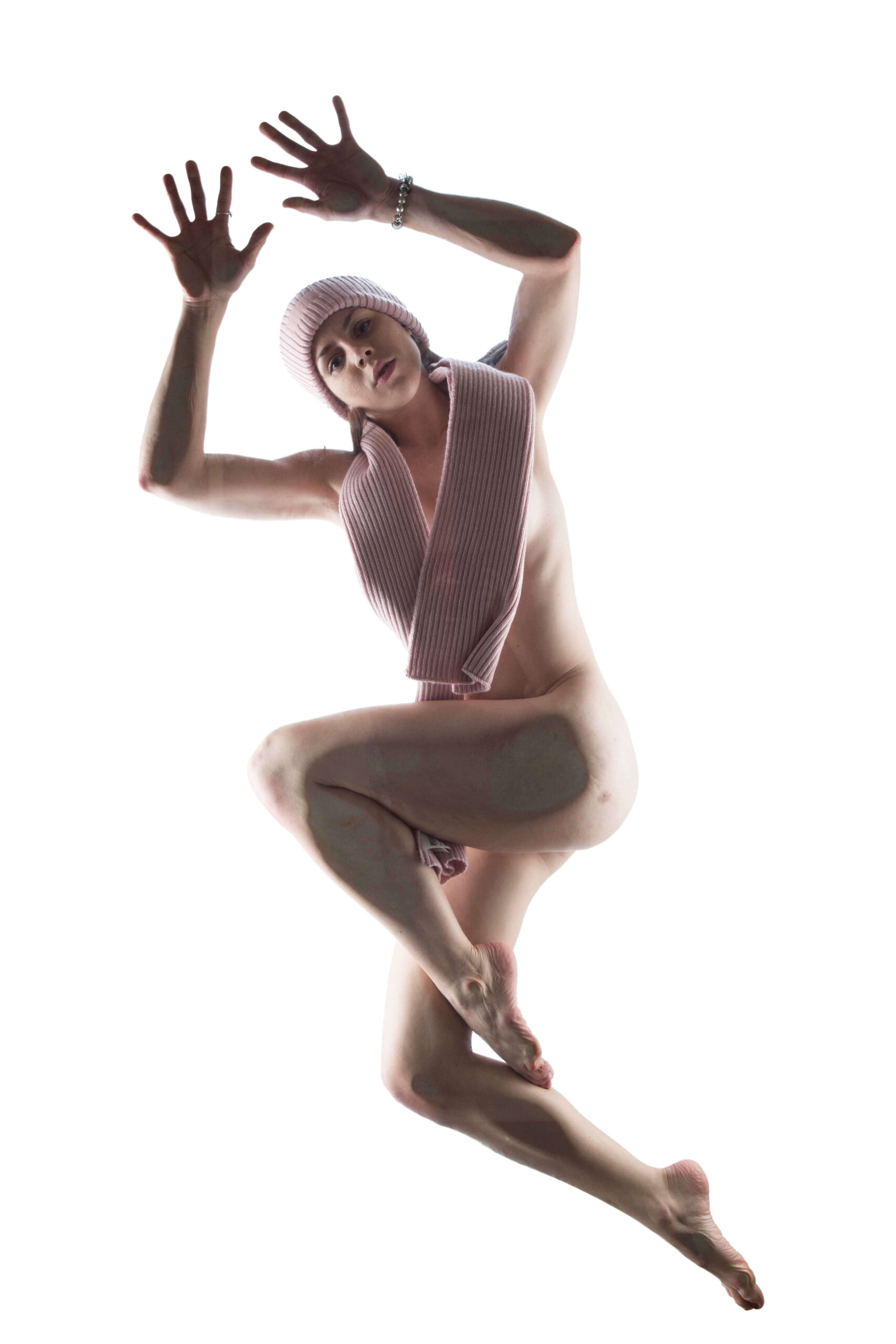 This is a set of images taken with Bianca Brunson during one of our shoots together. She is posing on a clear platform while wearing just a pink beanie and scarf with nothing else. Photographed in studio on 11-24-2019.
