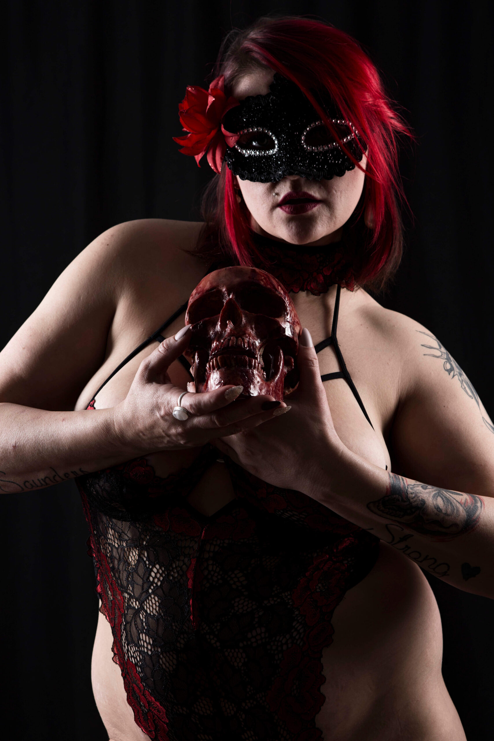 This is a set of images taken with Sara Saunders during our shoot together. This was photographed for my “Bone Collection” project. She is wearing a red and black bodysuit while posing on a black backdrop. She is using a red colored skull as a prop for this set.