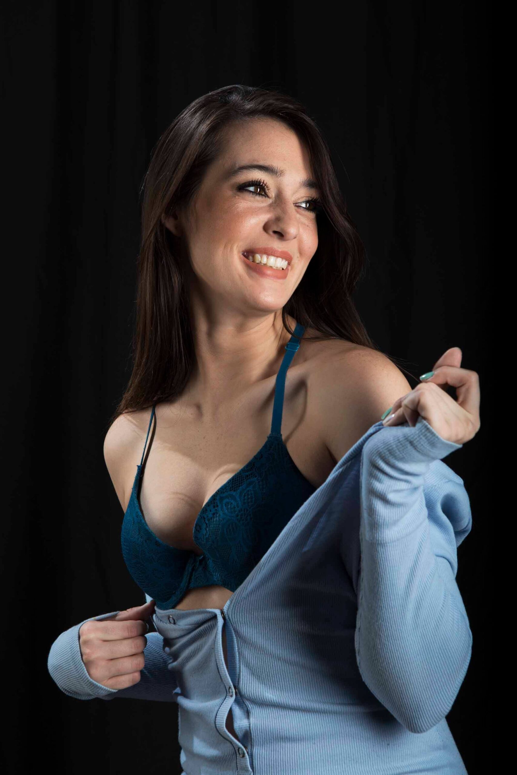 This is a set of images taken with Nikki Paige during one of our shoots together. She is posing on a black backdrop wearing a blue tight fitting outfit with dark blue bra. Photographed in studio on 11-23-2019.