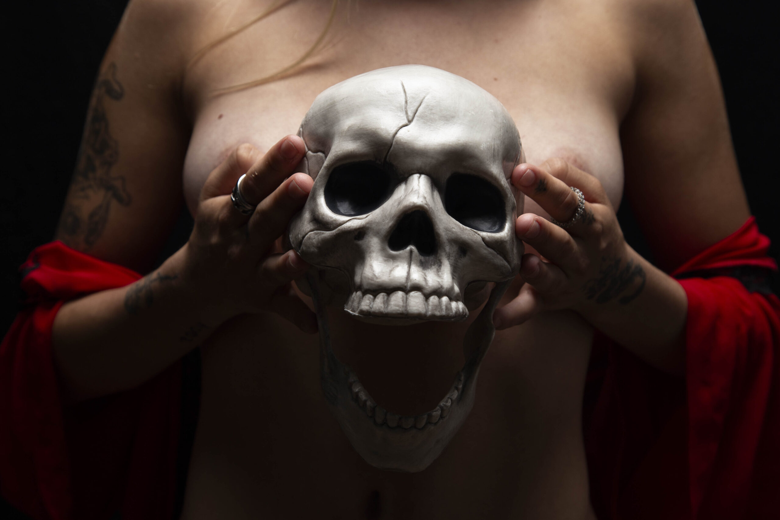 This is a set of images taken with Dreama during one of our shoots together. She is posing against a black backdrop wearing only a red cape and using a plastic skull as a prop. Photographed in studio on 8-24-2025.