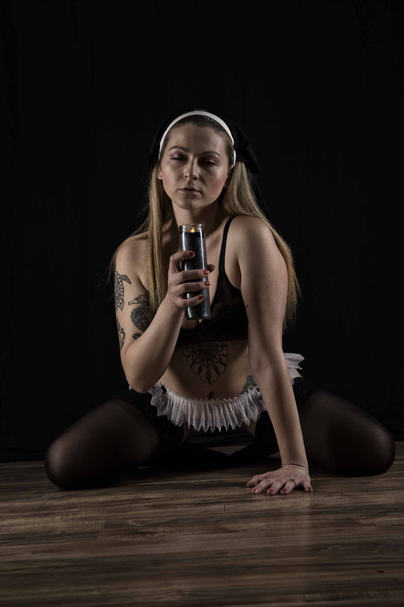 This is a set of images taken with Sarah Indigo Soul during one of our shoots together. She is wearing a black and white outfit with a white mini waist skirt while posing with a candle on the floor. Photographed in studio on 3-27-2021.