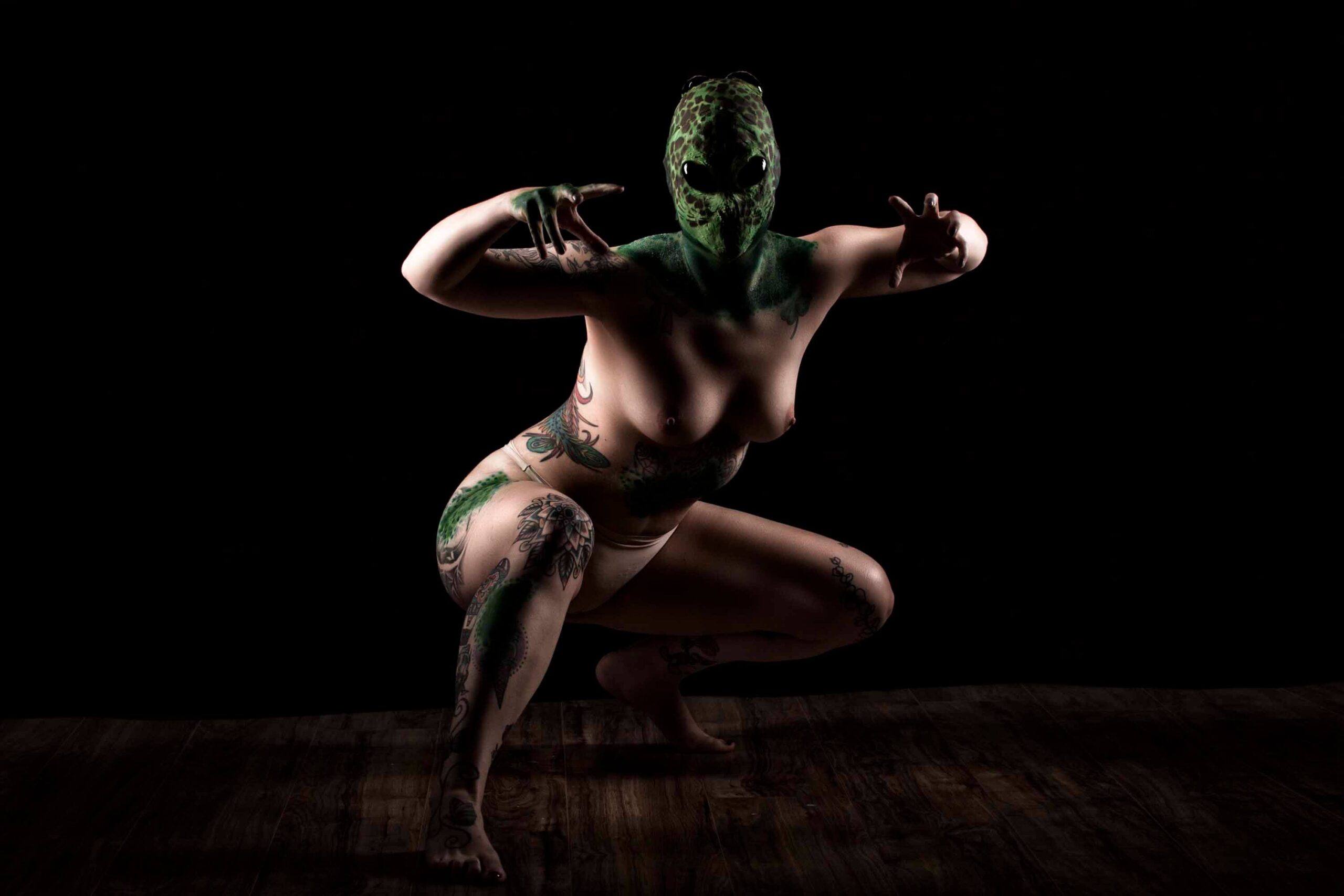 This is a set of images taken with Ronnie during our shoot together. This was shot for me “OKC X-Files” project. She is dressed in only natural colored panties with a custom made latex mask. The FX was provided by Ryynagade. Photographed in studio on 1-15-2019.