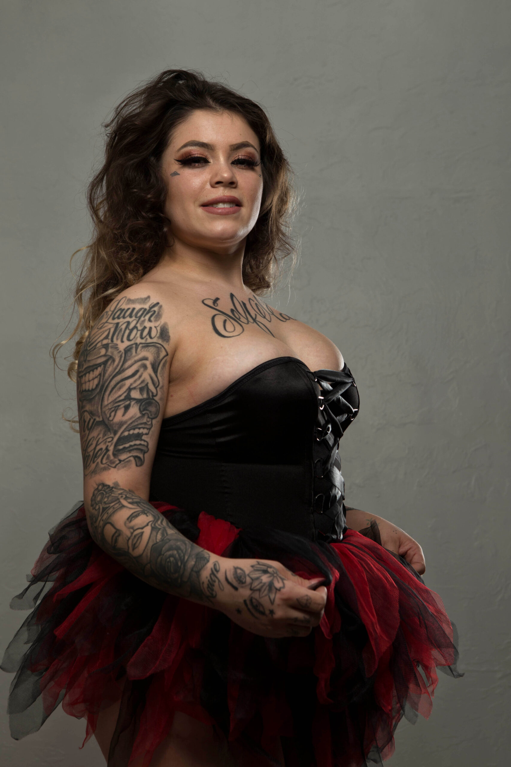 This is a set of images taken with Casey Josephine during one of our shoots together. She is posing in a wet looking black corset with a red and black tutu. Photographed in studio on 01-02-2021.