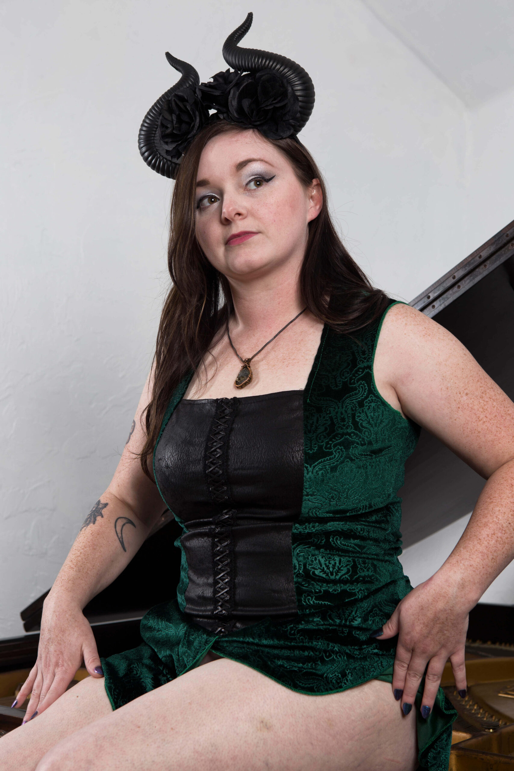 This is a set of imagers taken with Jade Oakes during our shoot together. She is posing in a green dress while wearing horns. She poses on a baby grand piano. Photographed in studio on 10-18-2023.