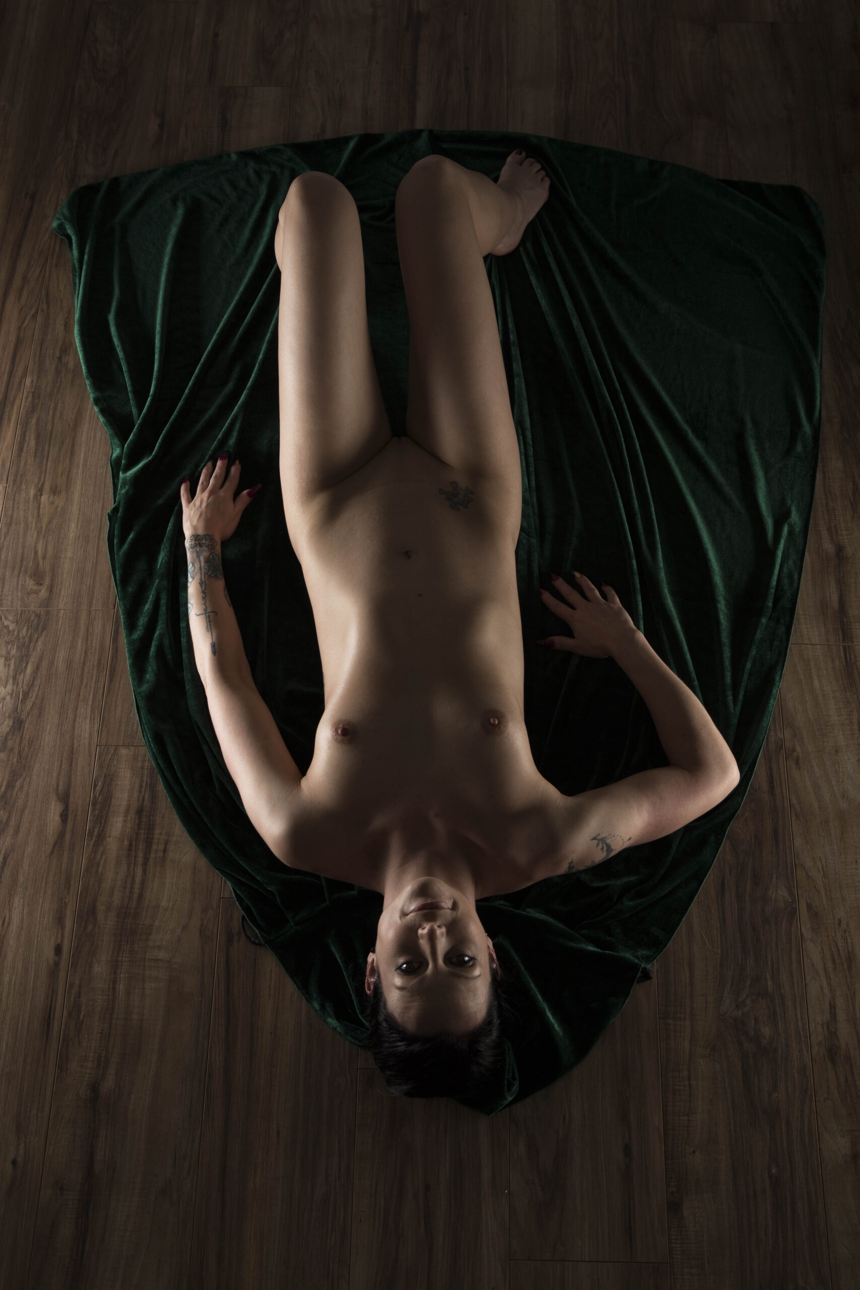 This is a set of images taken with Lucy Greene during one of our shoots together. She is posing on a green emerald cape laying on the floor. Photographed in studio on 03-13-2021.