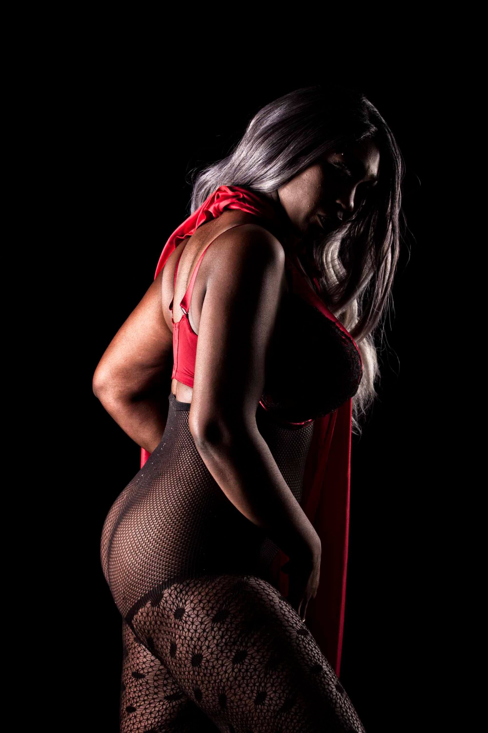 This is a set of images taken with Kristen Thomas during one of our shoots together. This was photographed for my “Red and Flesh” project. She is posing in just a red bra and red robe while standing in front of a black backdrop. Photographed in studio on 9-30-2018.