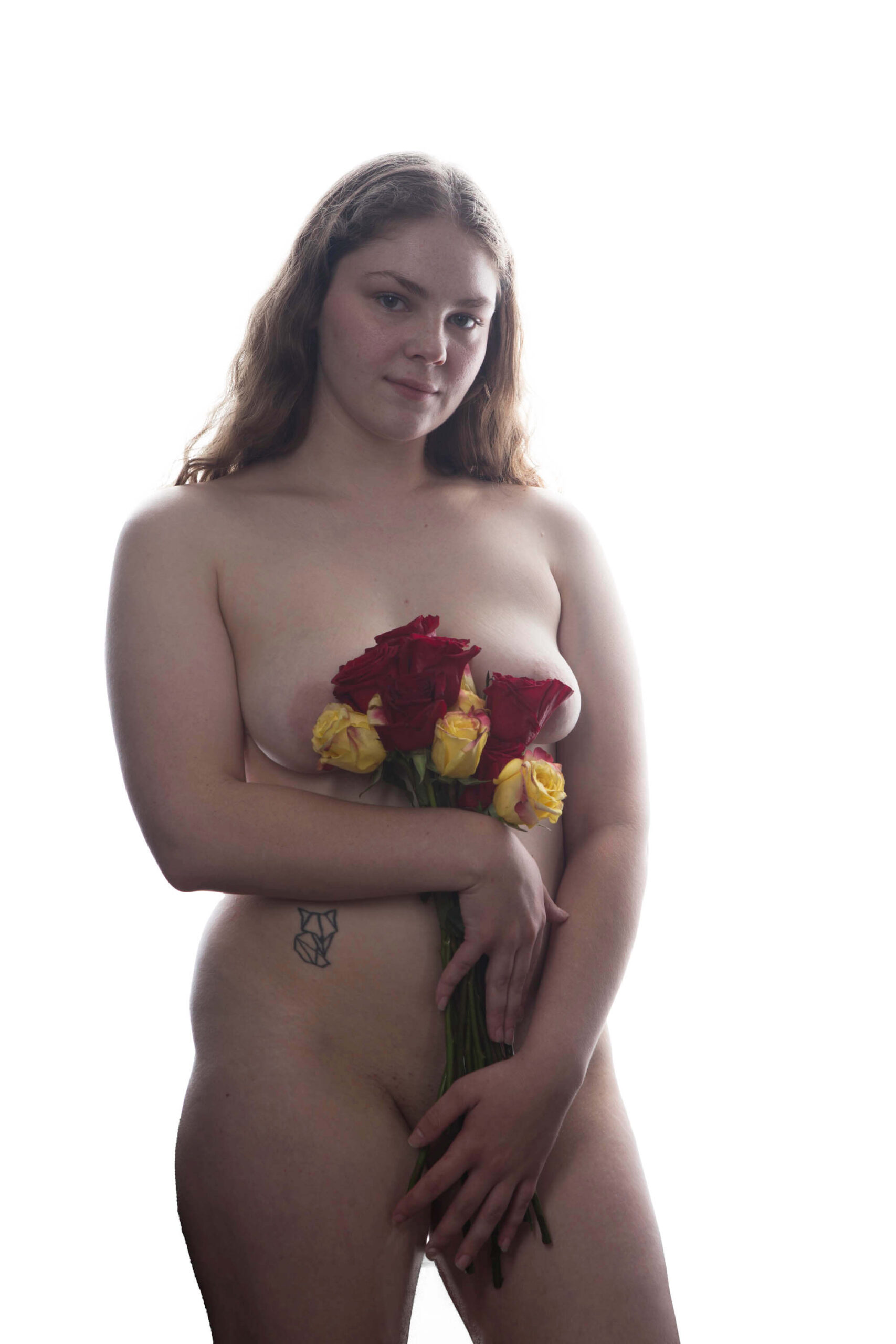 This is a set of images taken with Marry Customz during our shoot together. She is posing against a white backdrop while holding a small arrangements of flowers. Photographed in studio on 3-30-2024.
