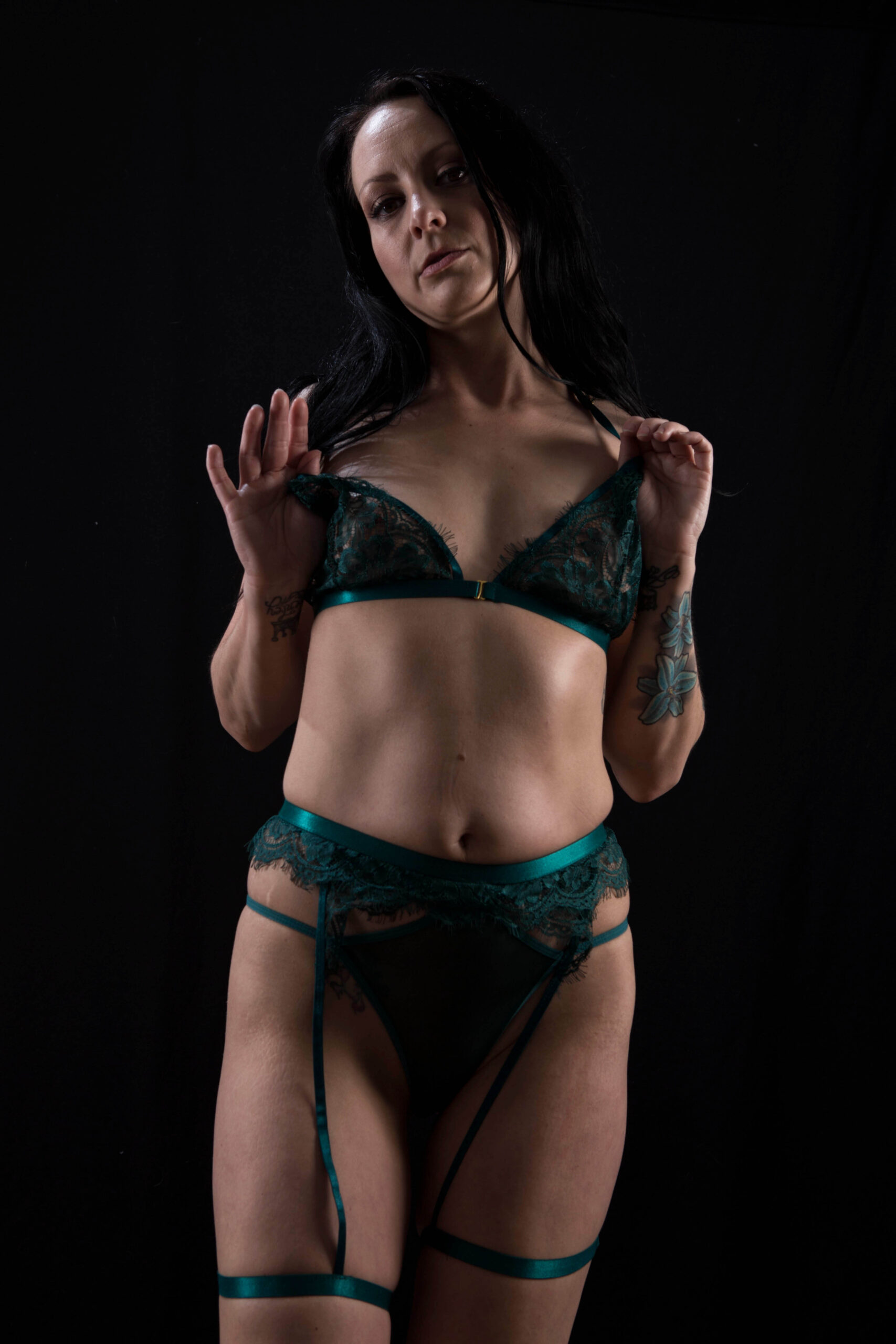 This is a set of images taken with Lucy Greene during one of our shoots together. She is posing against a black backdrop wearing a dark green lingerie set. Photographed in studio on 02-06-2021.