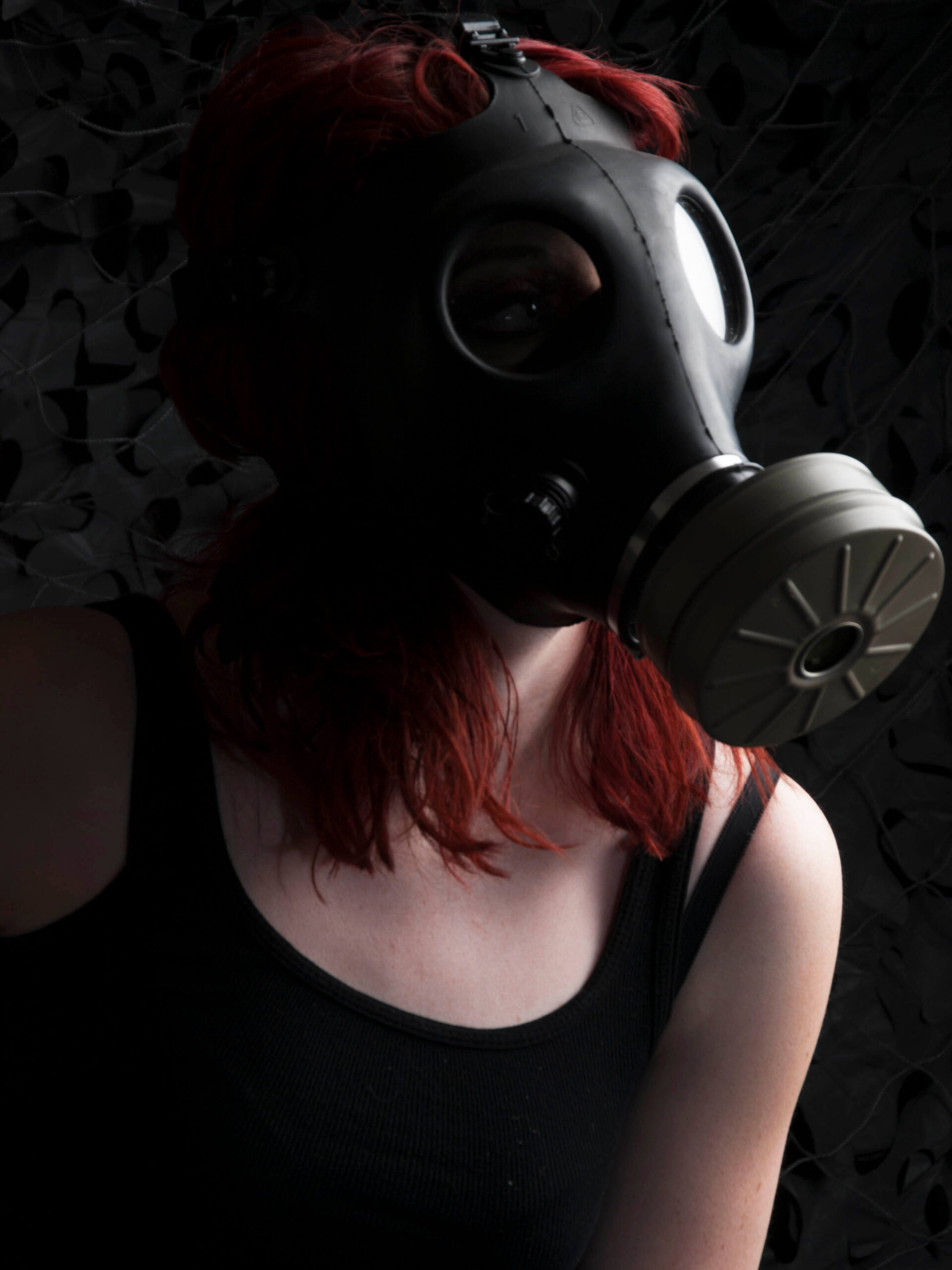 This is a set of images taken with Ashley Rachelle during our shoot together. This was photographed for my “Fallout Fems” project. She is wearing a black tank top with matching panties. She does this shoot wearing a U.S. Army gas mask. Photographed in studio on 5-14-2011.