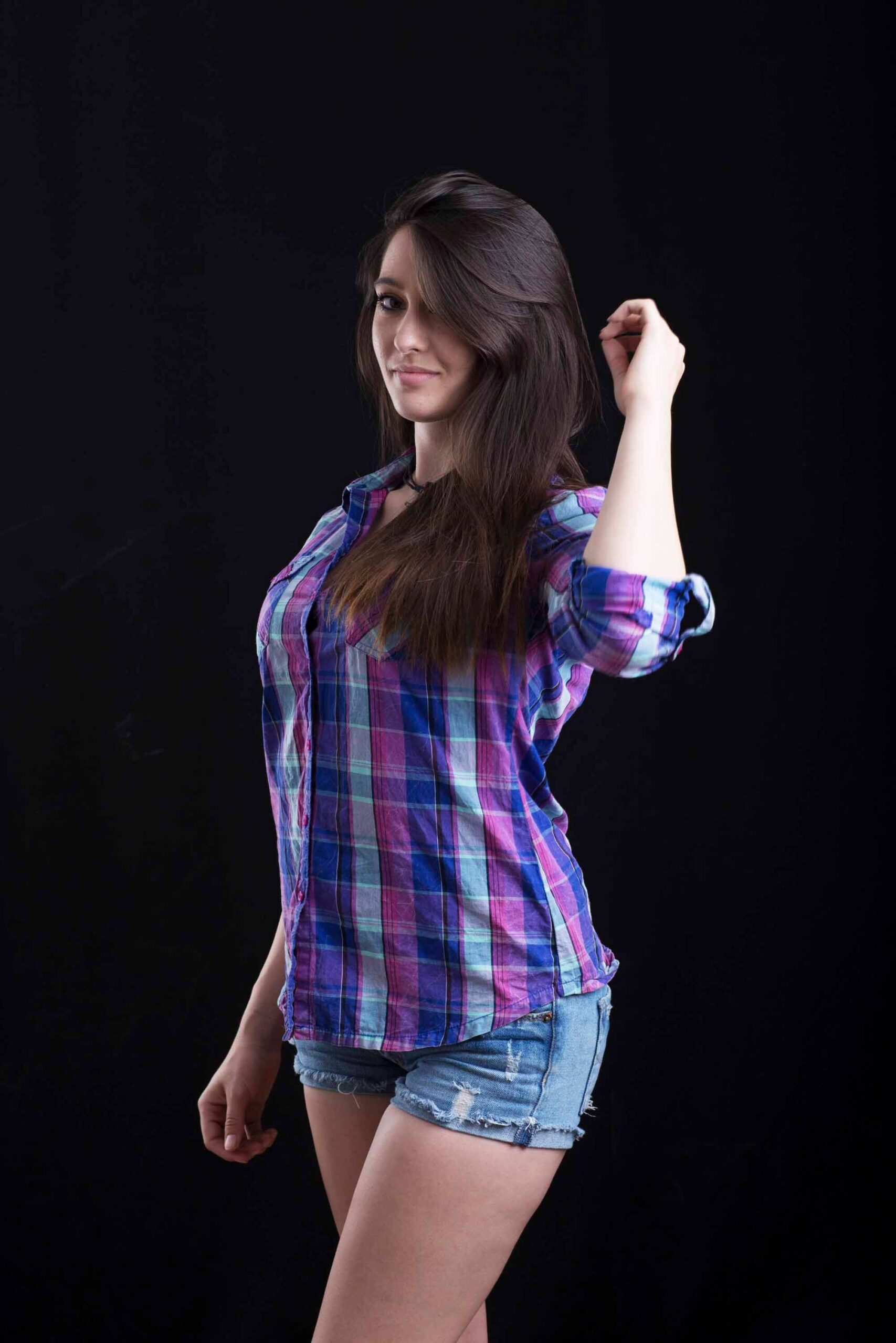 This is a set of images taken with Nikki Paige during one of our shoots together. She is dressed in a purple plaid button up with jean shorts. Photographed in studio on 4-25-2017.
