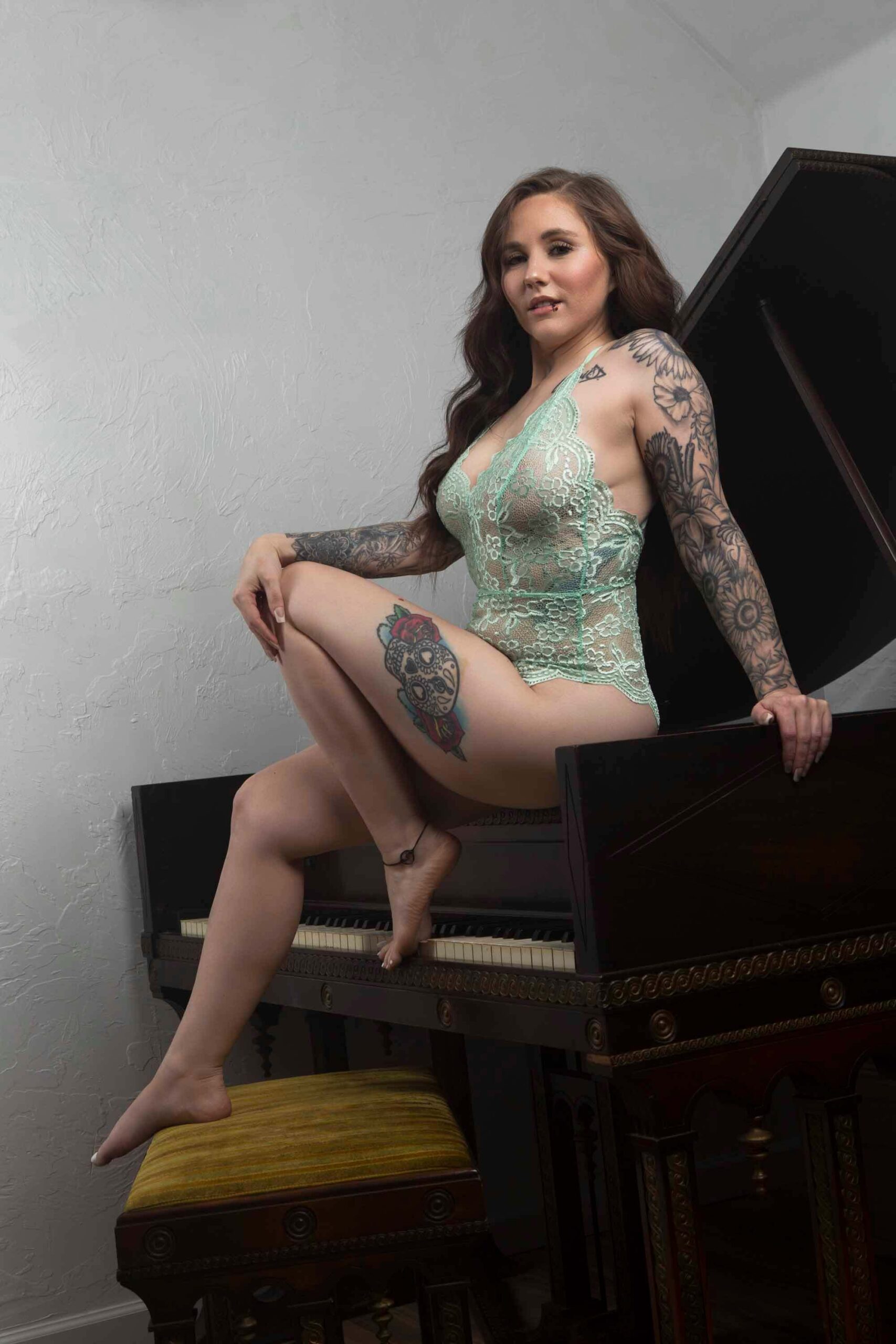 This is a set of images taken with Kya Kush during our shoot together. She is posing on a baby grand piano wearing a light green bodysuit. This was her warm up set. Photographed in studio on 4-05-2024.