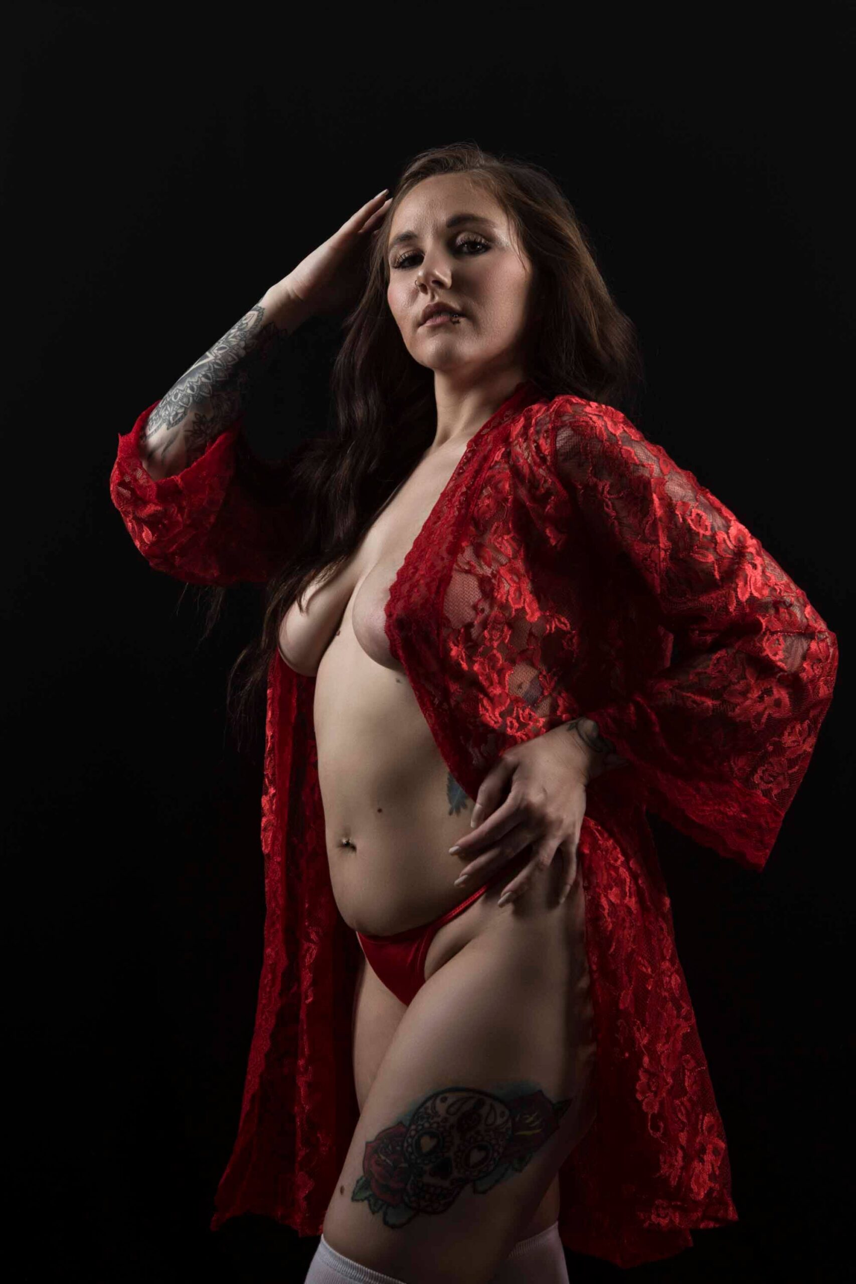This is a set of images taken with Kya Kush during one of our shoots together. This was photographed for my “Red and Flesh” project. She is posing on a black backdrop while wearing just a red lace robe and matching panties. Photographed in studio on 4-05-2024.
