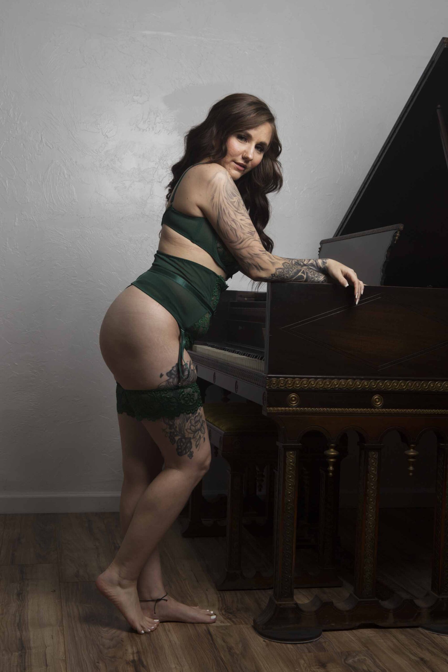 This is a set of images taken with Kya Kush during one of our shoots together. She is posing next to a baby grand piano wearing a dark green lingerie set. Photographed in studio on 4-05-2024.