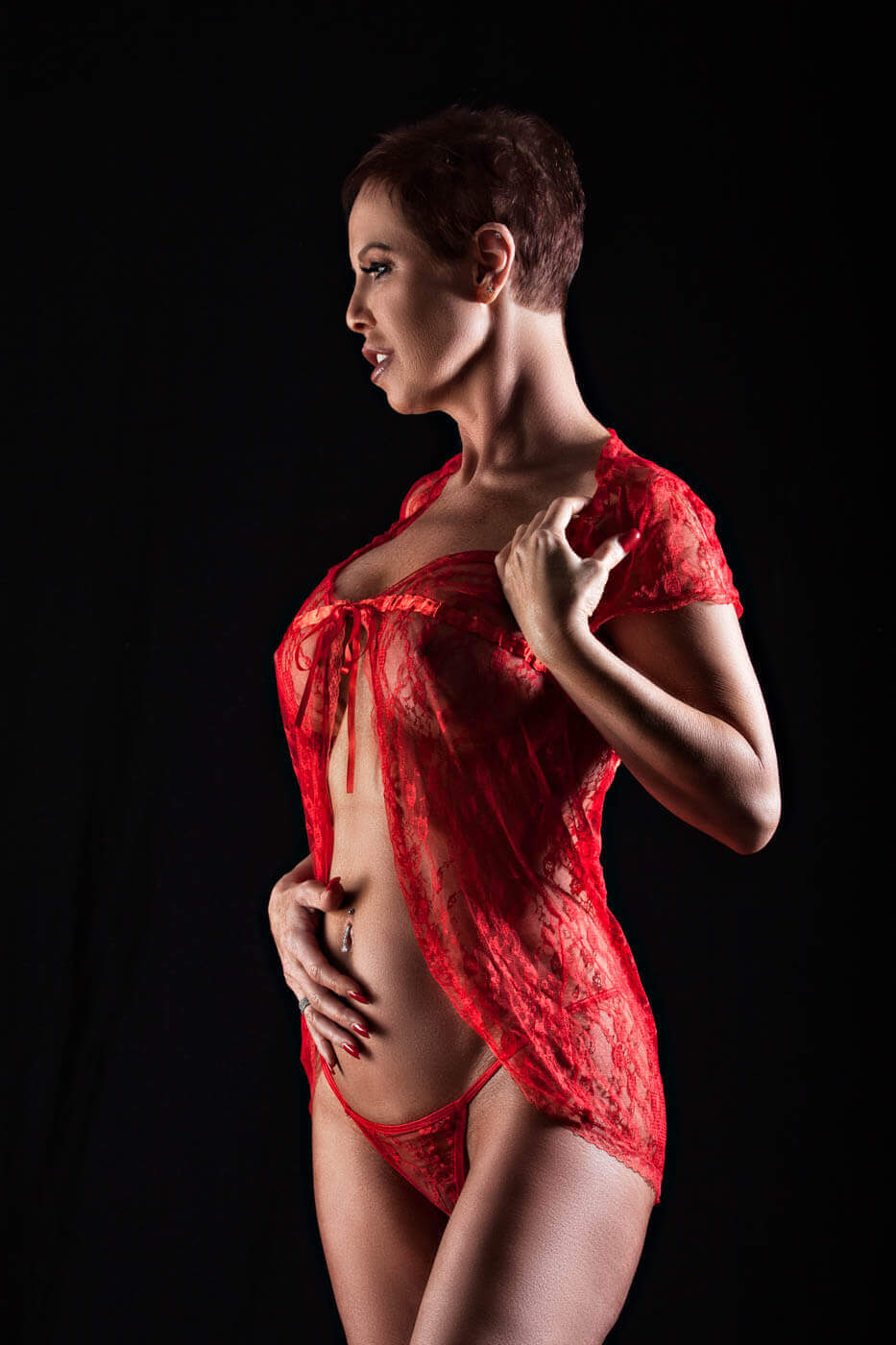 This is a set of images taken with Diane Smith during one of our shoots together. She is posing on a black backdrop wearing a red lingerie outfit with matching panties. Halfway through the shoot she removes her panties and opens her top for a sexier shot. Photographed in studio on 1-21-2018.