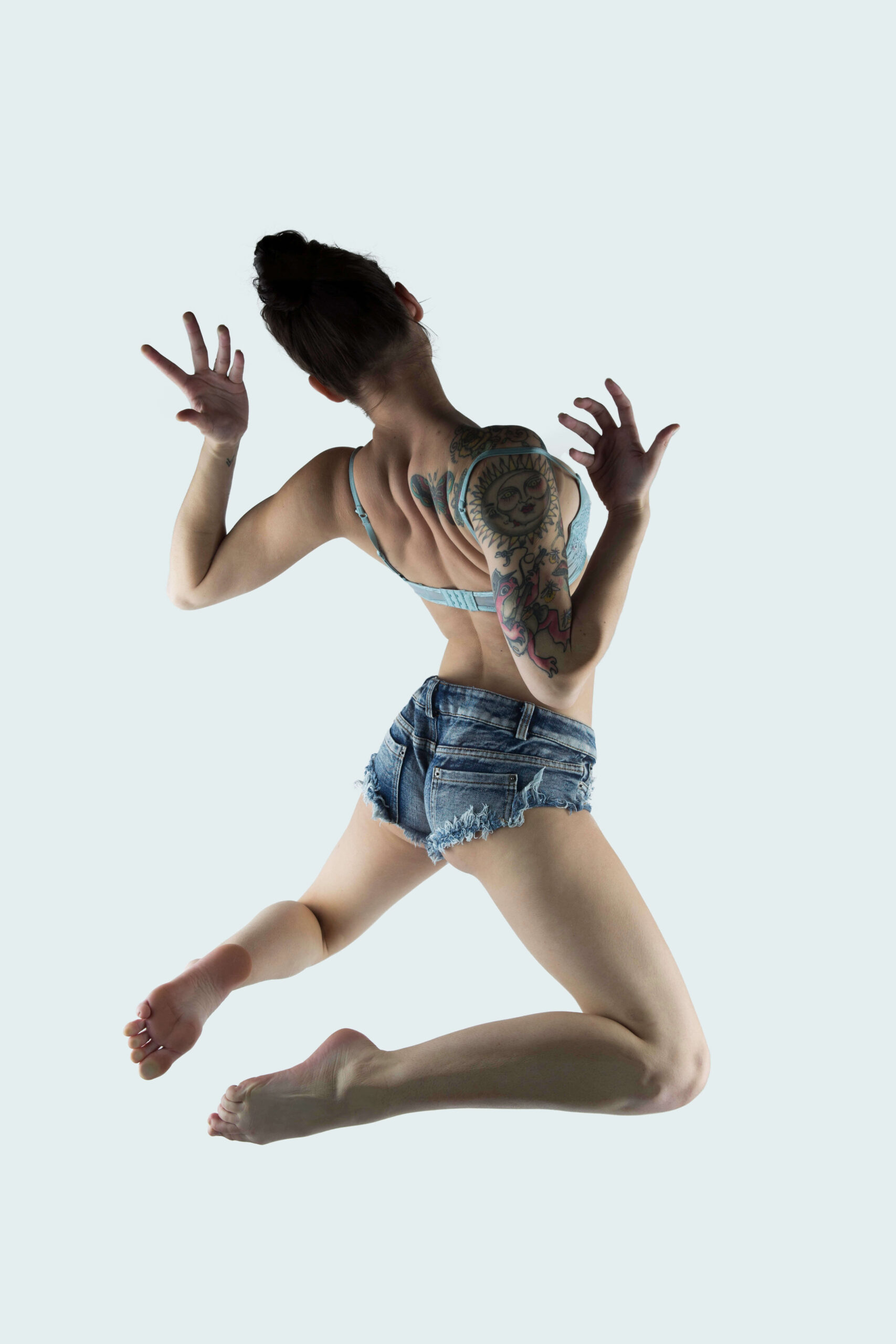 This is a set of images taken with Ayeonna Gabrielle during one of our shoots together. She is posing on a clear platform while wearing jean shorts and light blue bra. Photographed in studio on 03-02-2021.