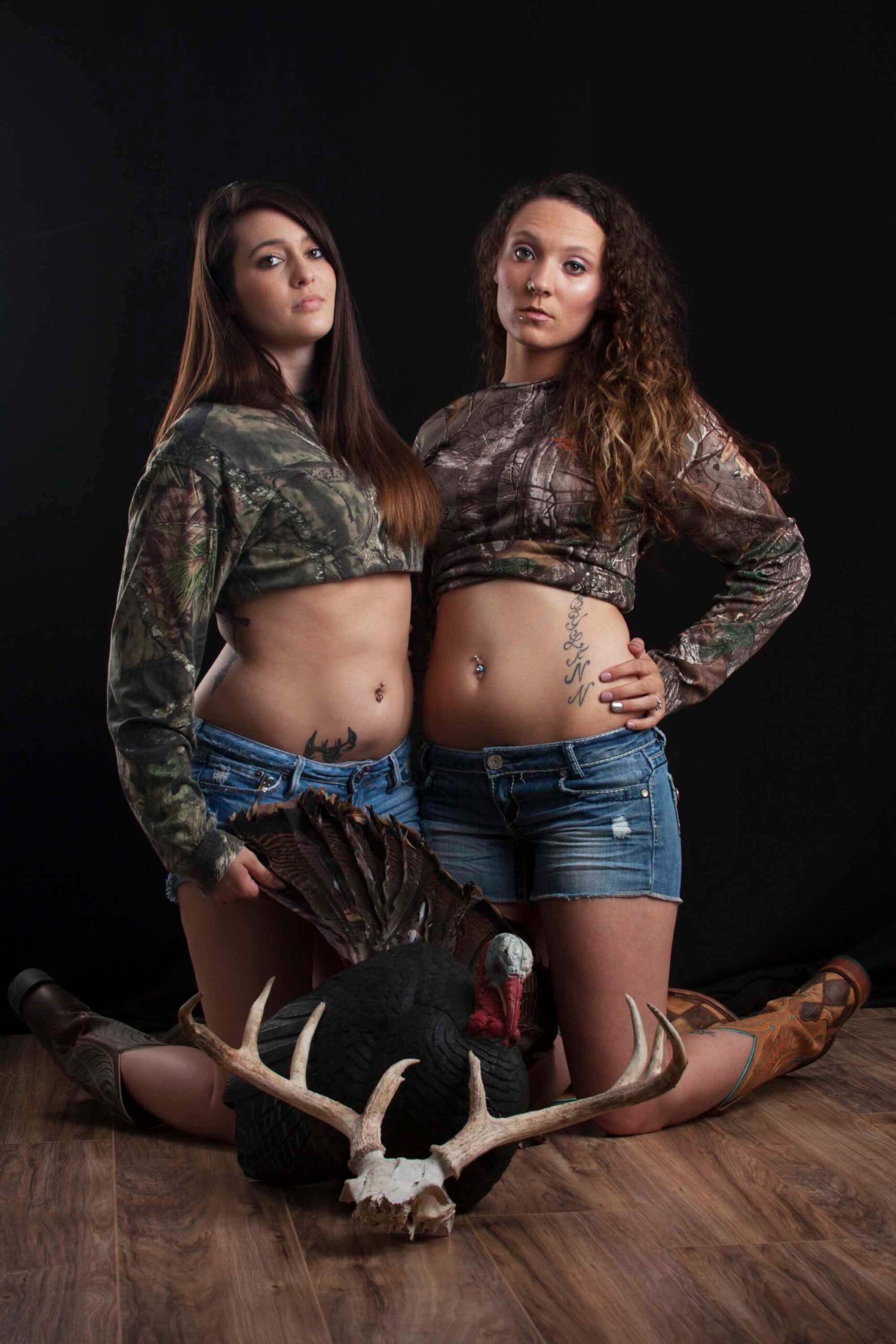 This is a set of images taken with Nikki Paige and Montana H. during one of our shoots together. They are both wearing camoflauge tops with fitted jean shorts. They are posing next to horns and a turkey. Photographed in studio on 4-25-2017.