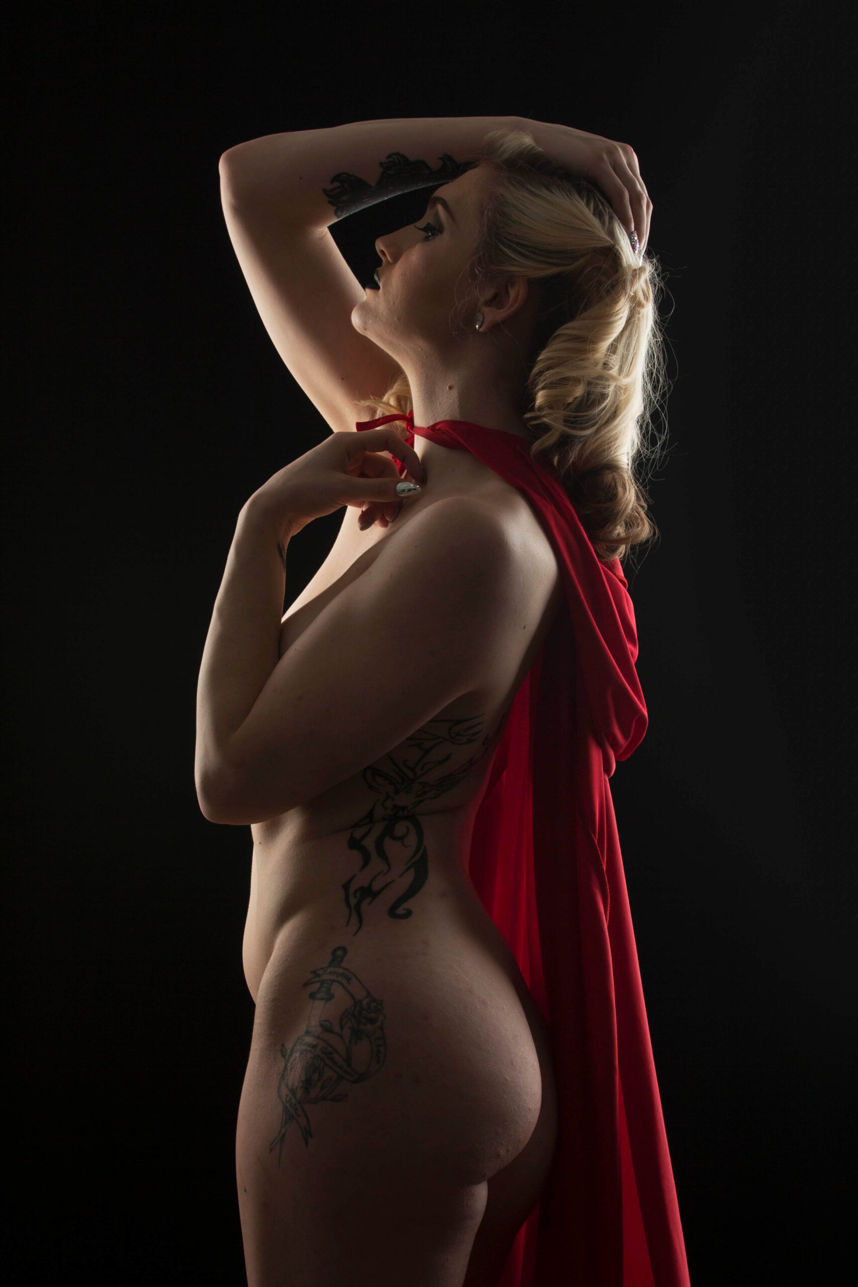 This is a set of images taken with Gavy Wiegleb during one of our shoots together. For this set she is just wearing a red cape. Shot against a black backdrop. Photographed in studio on 4-14-2018.