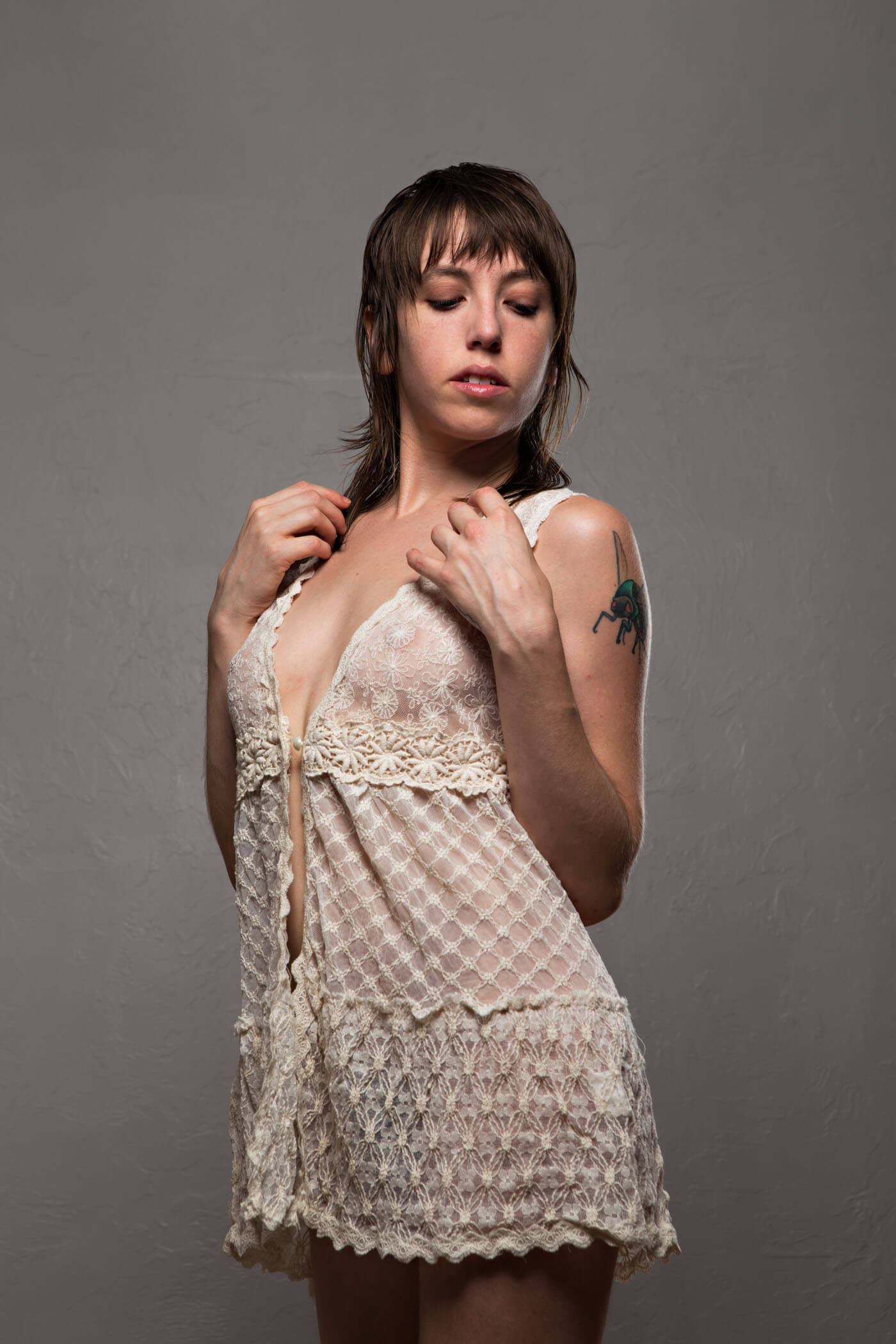 This is a set of images taken with Melancholic during our shoot together. She is posing against a grey backdrop while wearing just a lace coverup. Photographed in studio on 7-20-2020.