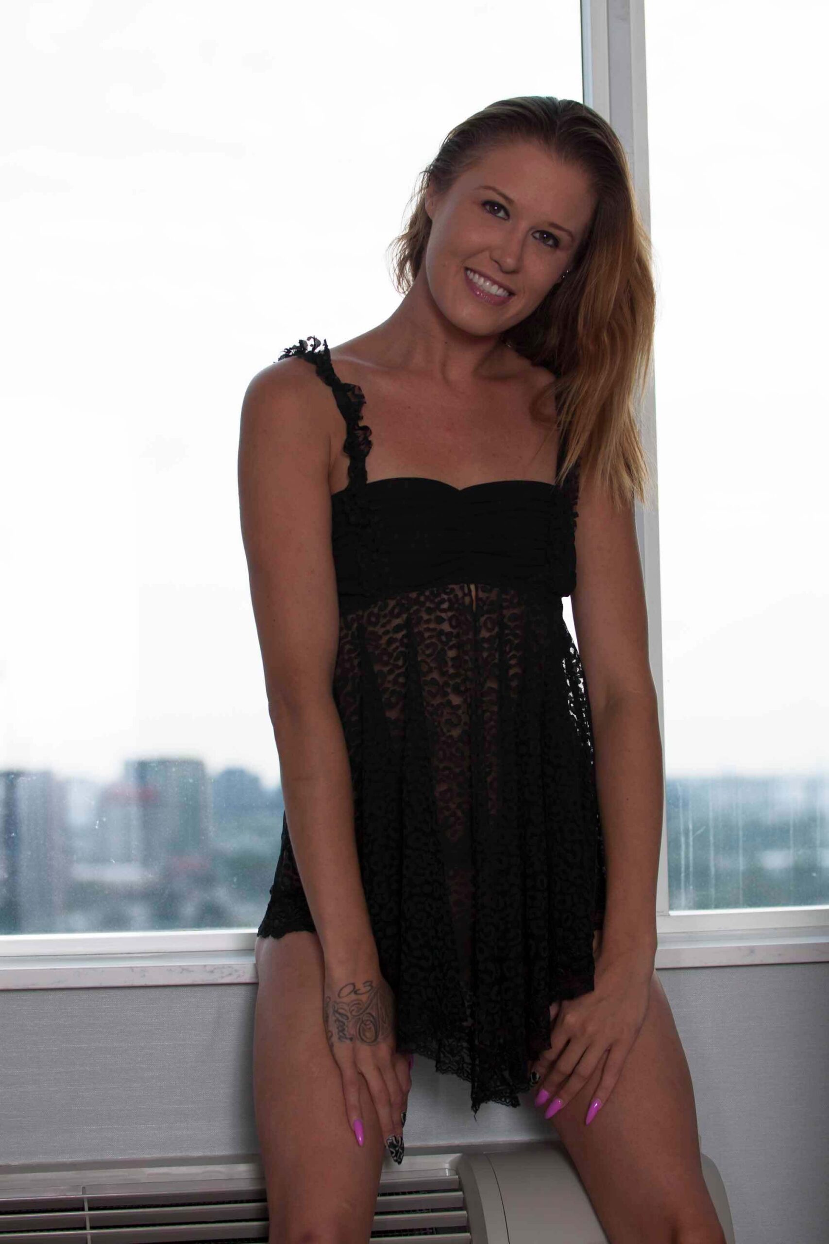 This is a set of images taken with Shannon Stretton during our shoot together. She is posing near a large window wearing a black lingerie outfit without bottoms. To prove it, she shows you she doesn’t have any. Photographed in a hotel in Toronto, Canada on 07-12-2018.