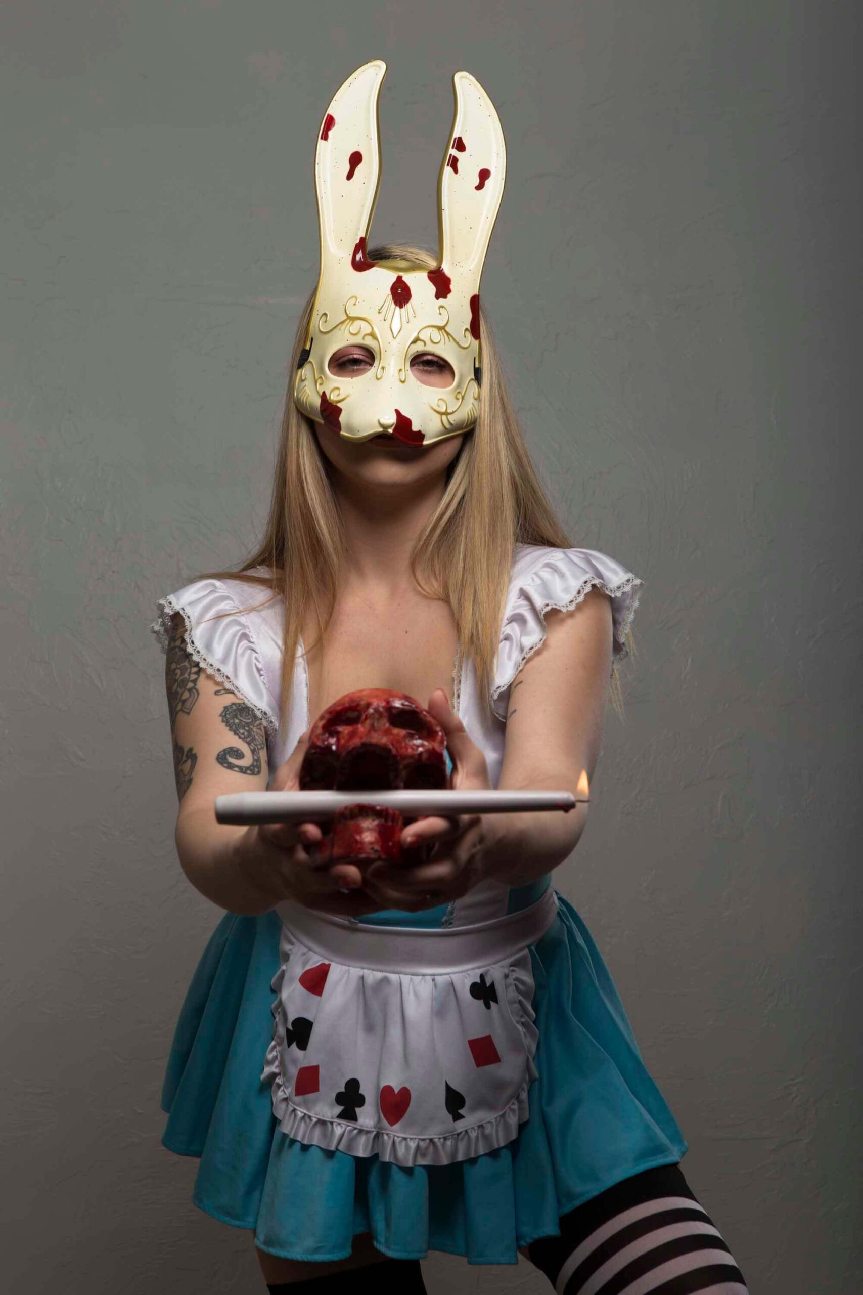 This is a set of images taken with Sarah indigo Soul during one of our shoots together. She brought a costume to wear with a rabbit mask and holding a skull and candle. Photographed in studio on 03-27-2021.