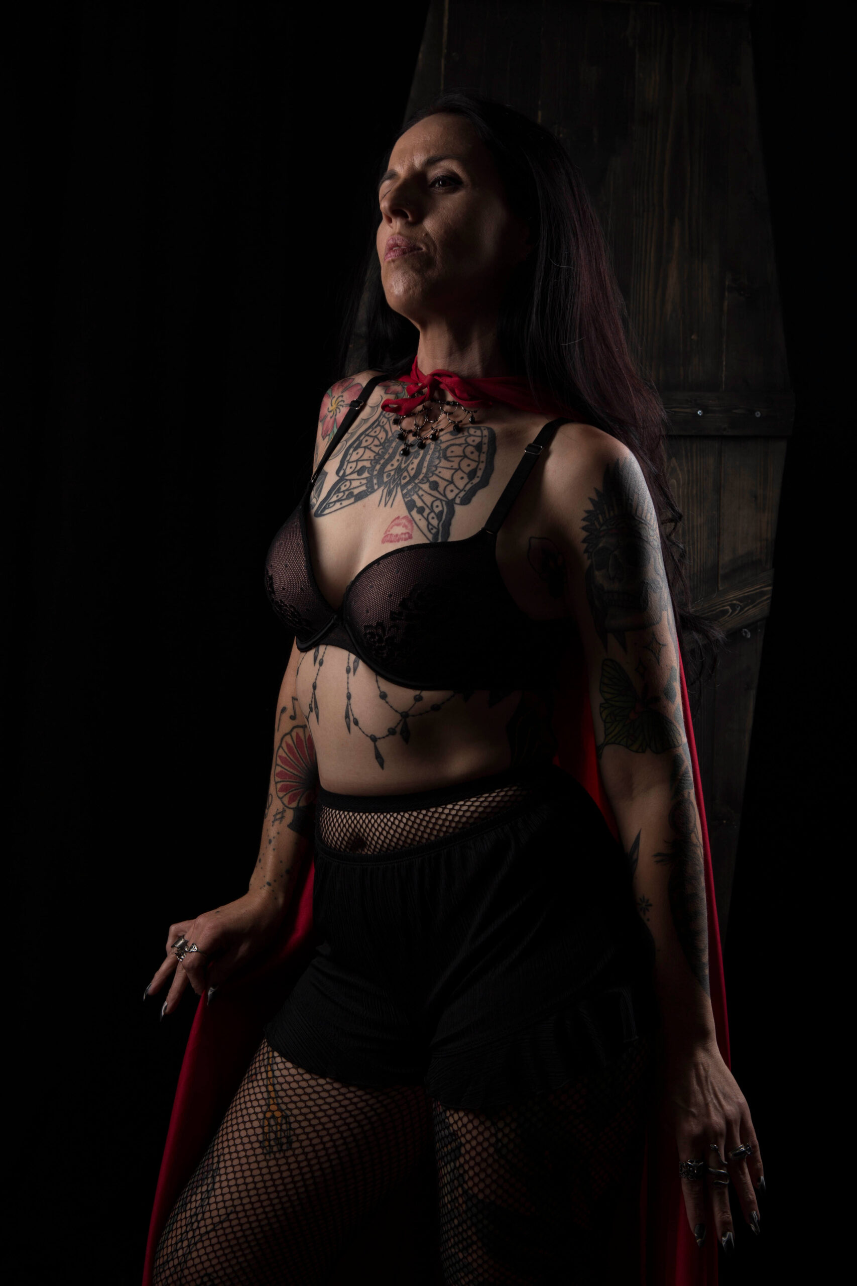 This is a set of images taken with Ladye Laine during one of our shoots together. She is posing in a black lingerie set with a red cloak in front of a toe-pinch casket. Photographed in studio on 05-07-2022.