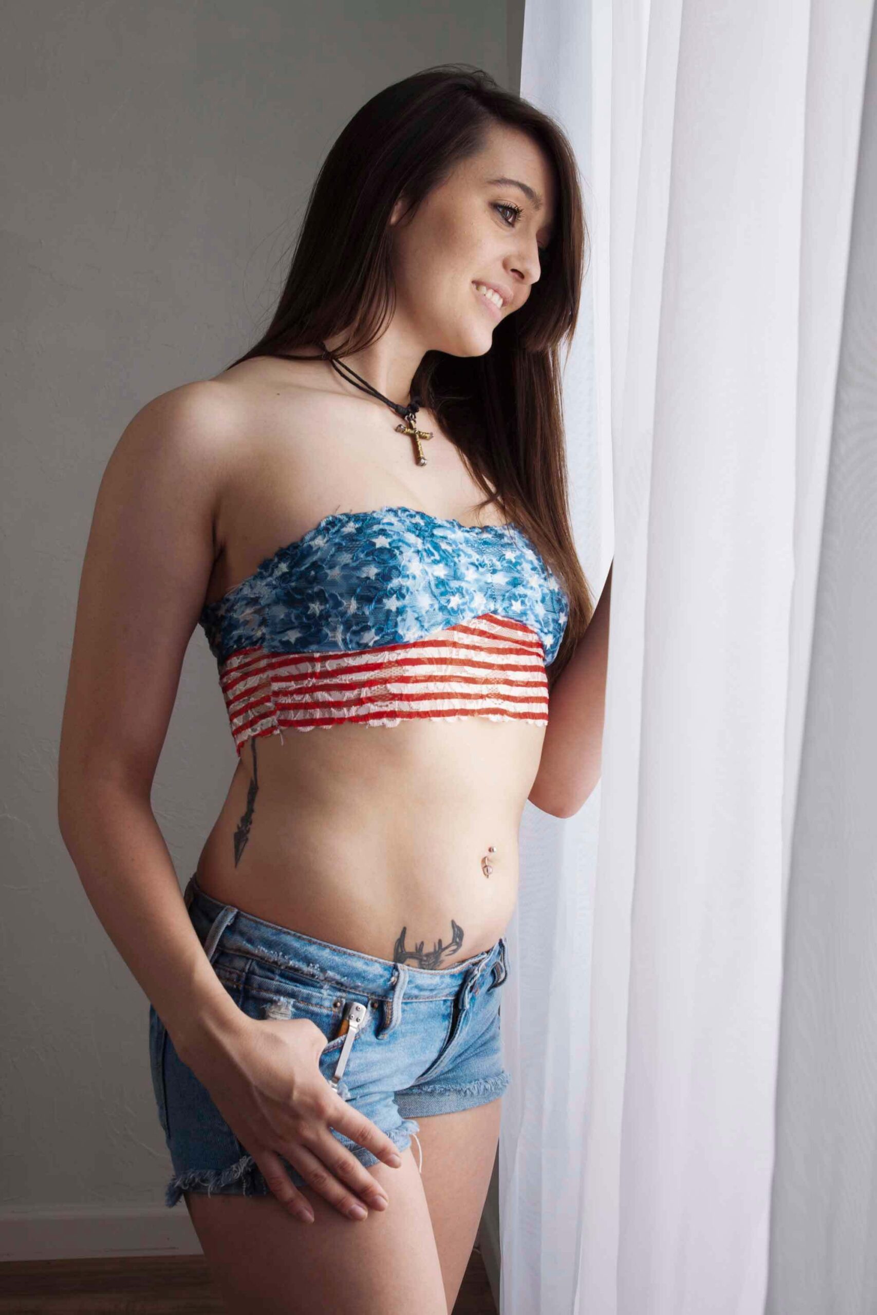 This is a set of images taken with Nikki Paige during one of our shoots together. She is wearing a red, white and blue tube top with jean shorts. Photographed in studio on 4-25-2017.