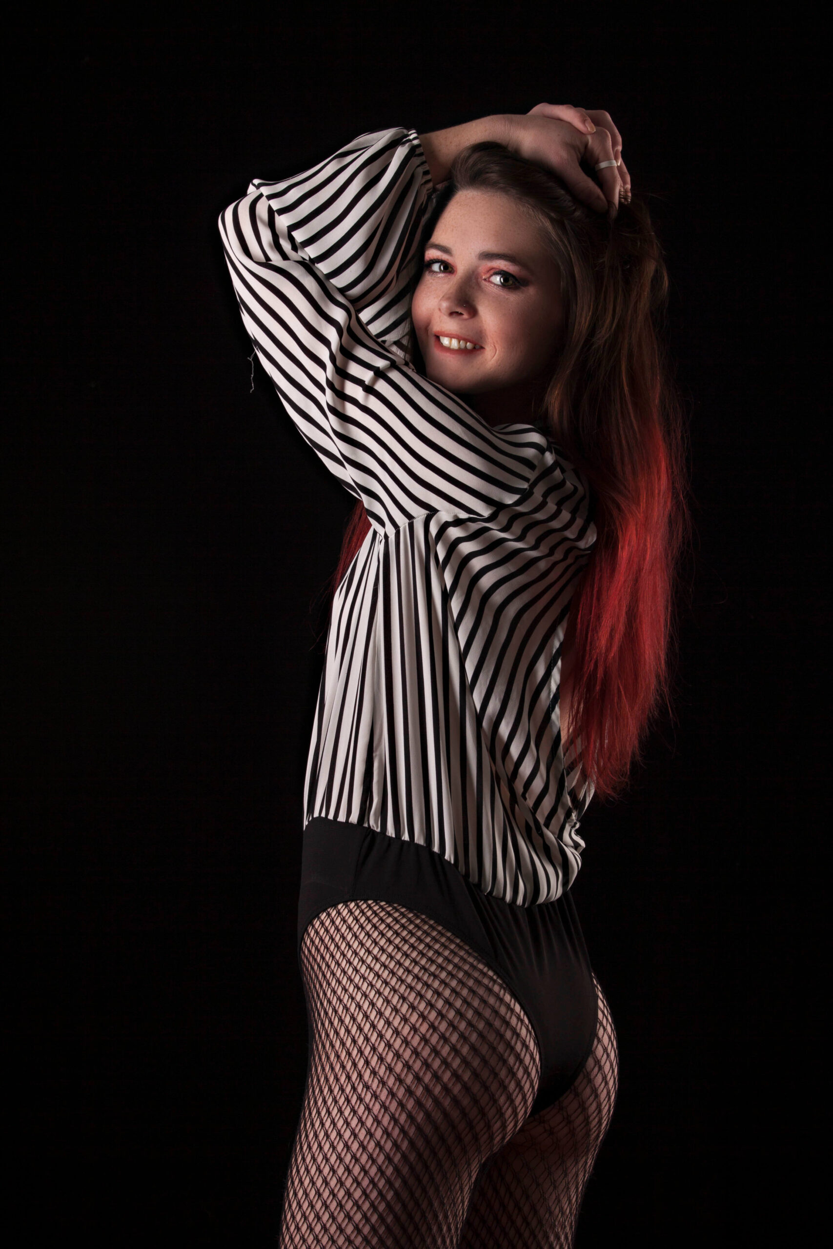 This is a set of images taken with Autum Mccleery during our shoot together. This was a warm up set where she is wearing a black and white long sleeve top with a body suit bottom. She is also wearing black leggings made of mesh. Photographed in studio on 2-24-2019.