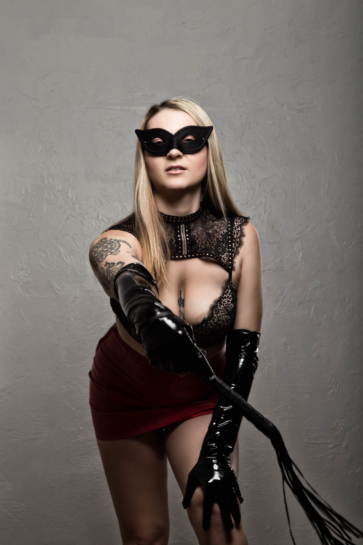 This is a set of images taken with Sarah Indigo Soul during one of our shoots together. She is wearing a tight red skirt with a black bra, gloves and mask. She does swing around a small whip as a prop. Photographed in studio on 03-27-2021.