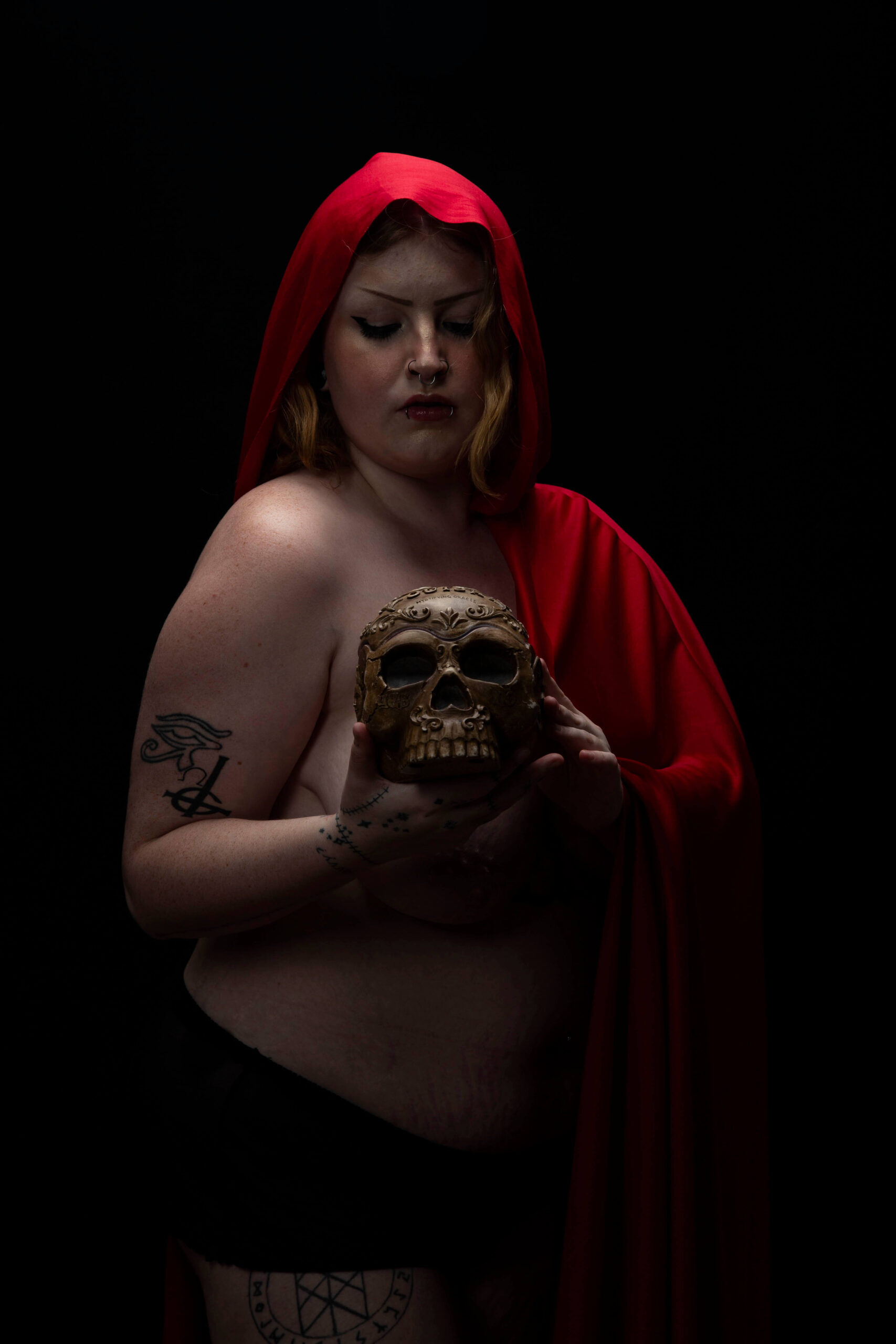 This is a set of images taken with Jessica Allen during one of our shoots together. This was photographed for my “Bone Collection” project. She starts off posing topless with a red cloak and black panties. Towards the end of the shoot she ditches her panties to shoot nude. Photographed in studio on 10-02-2025.