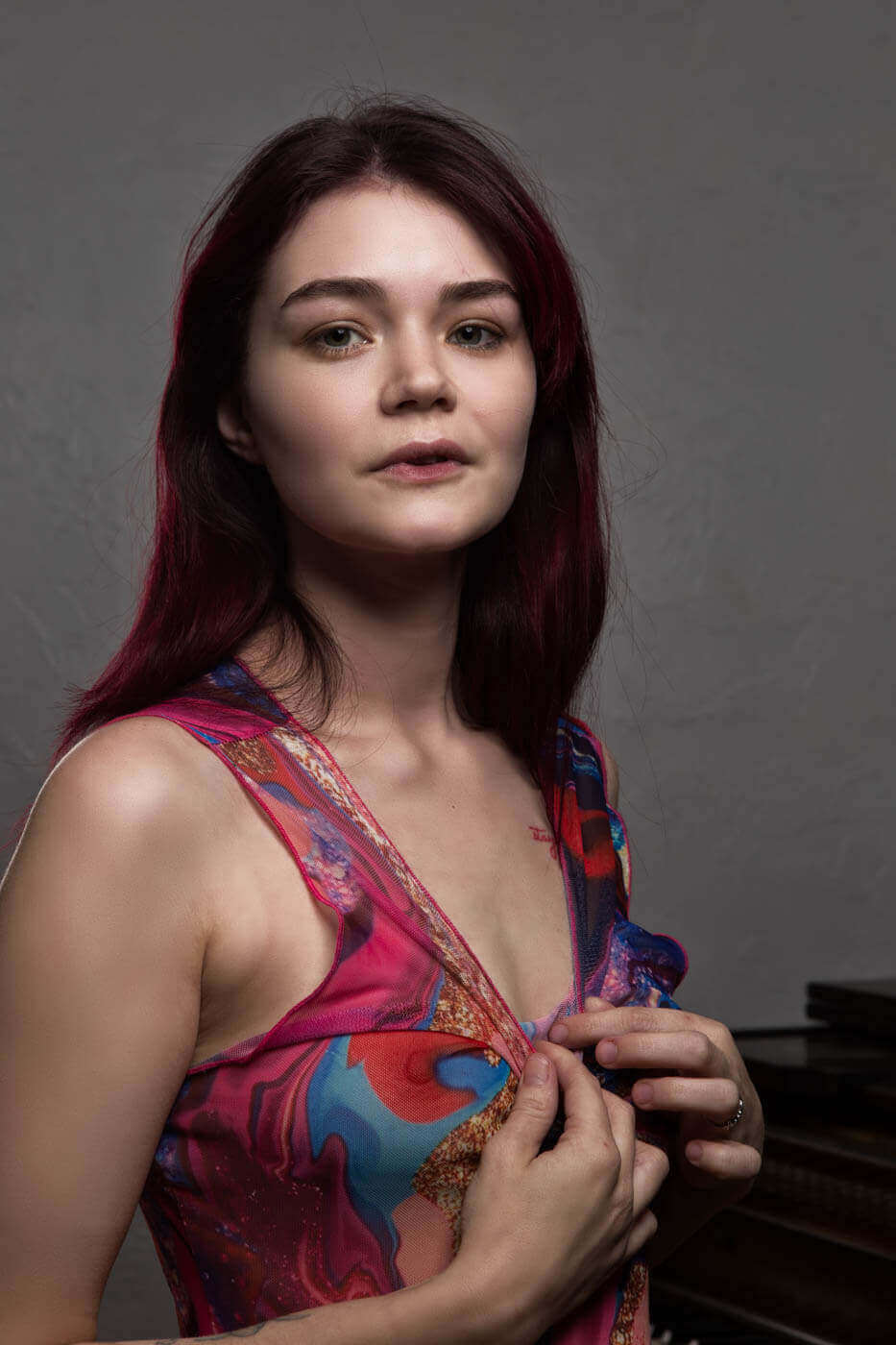 This is a set of images taken with PositivelyComplicated during one of our shoots together. She is wearing a very colorful skirt while posing next to a baby grand piano. Photographed in studio on 12-27-2021.