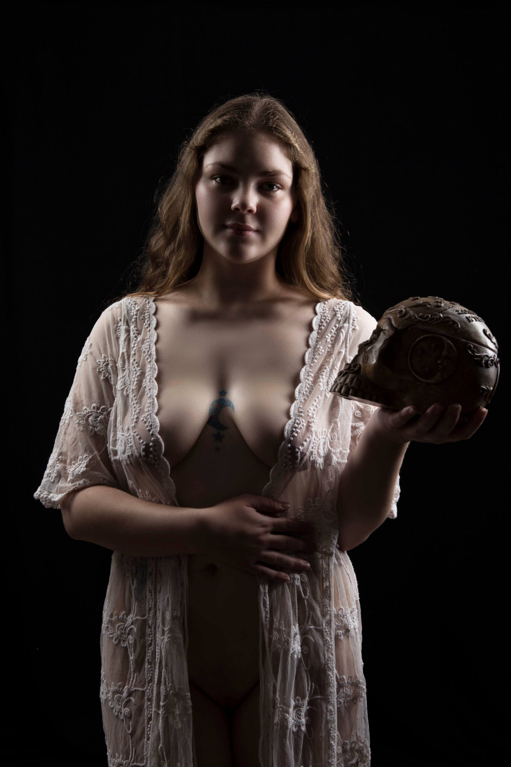 This is a set of images taken with Marry Customz during our shoot together. This was photographed for my “Bone Collections” project. She is nude with just a white lace robe while holding a skull. Photographed on a black backdrop on 3-30-2024.