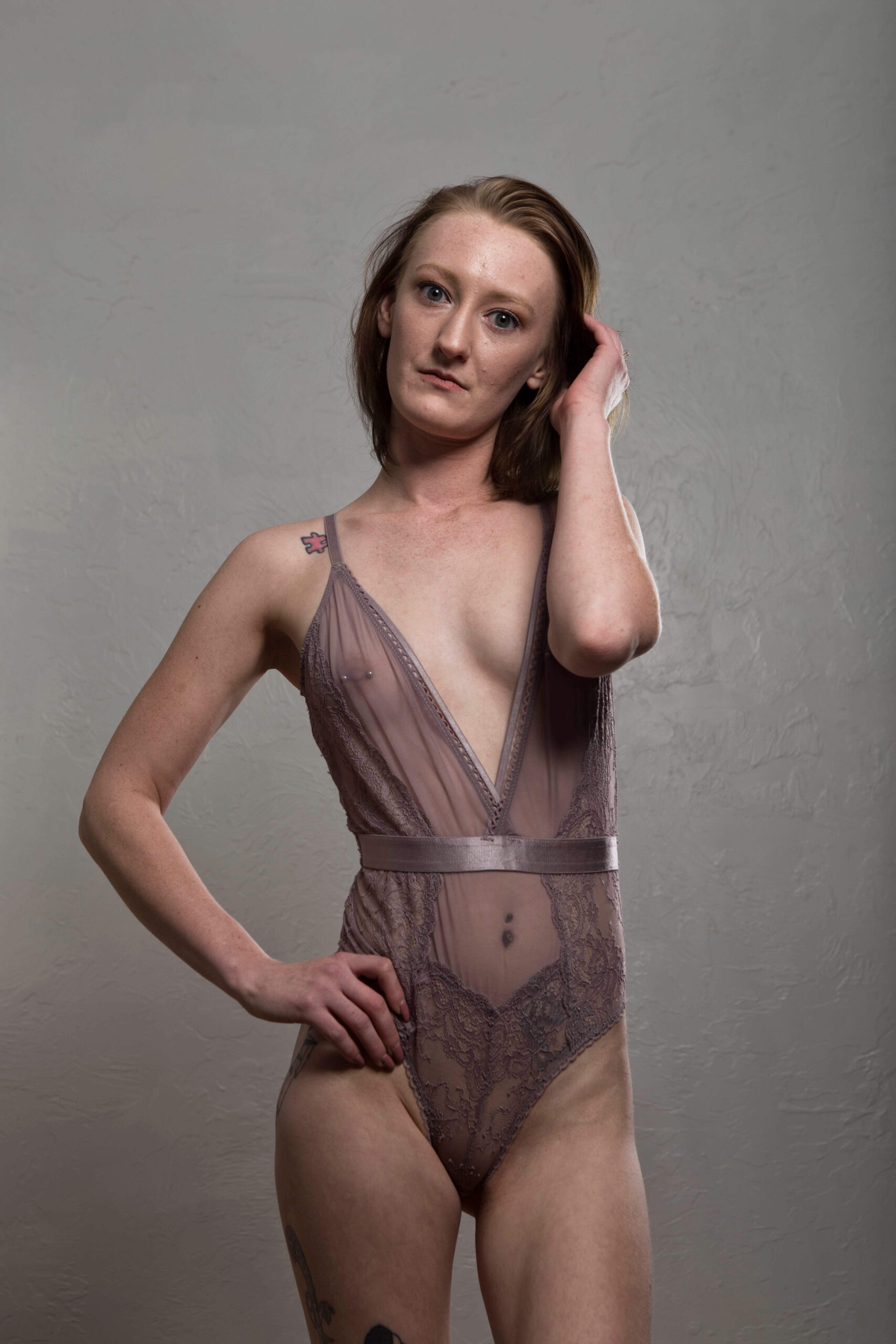 This is a set of images taken with Britney Sebourn during one of our shoots together. She is posing against a grey backdrop while wearing a light lavender bodysuit. Photographed in studio on 12-11-2020.