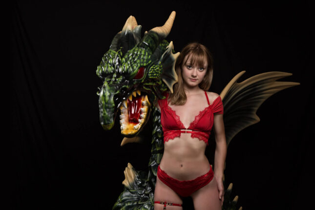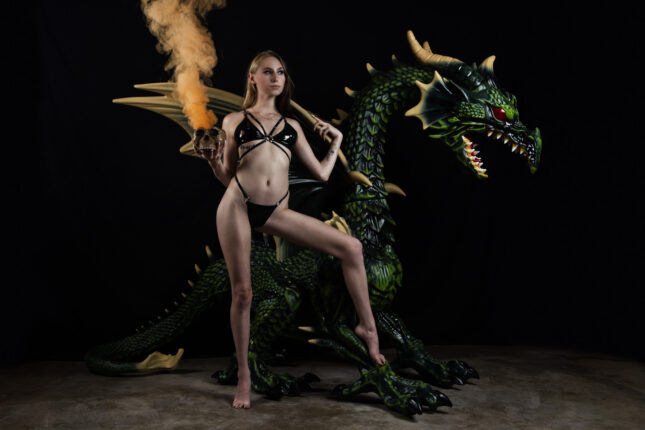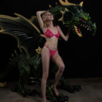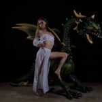 But this isn’t just cosplay or fantasy portraiture. It’s about transformation through context. Placing these elegant, confident women beside a kitschy dragon creates an unexpected narrative—a visual joke, a surreal story, a moment frozen between fantasy and reality. The models remain the stars of the frame, but the dragon alters the tone: adding drama, whimsy, or a playful threat to the scene.